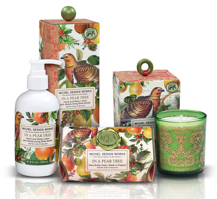 A stately partridge sits among tree branches laden with pears—the stars of the twelve days of Christmas as sung in the classic English carol. Scent of ripe pear with notes of apple and melon finished with hints of toffee and musk is now avaible in our In a Pear Tree Gift set. It includes our triple-milled soap that is silky smooth and long lasting, and contains the finest pure palm oil, glycerin, and rich shea butter. Our hand and body lotion that is made with shea butter, aloe, and other botanical ingredients. And our all-natural, 100% soy wax candle that is nontoxic, biodegradable, and clean burning.