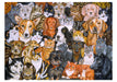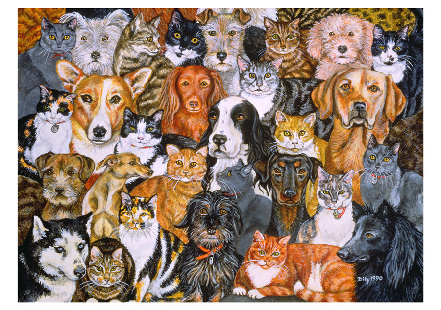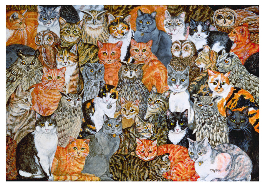 20 blank notecards (5 each of 4 designs) with envelopes in a decorative box and printed on recycled paper. Austrian artist Ditz paints house pets and farm animals, often in sweet domestic settings or grouped together like the cats in these notecards. Her distinctive style has evolved over time to include highly detailed, quirky, small-scale images. In each painting featured here, a clutter of cats poses. Three of the images include other critters: a parliament of owls, a hug of teddy bears, and a diversity of dogs.
