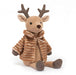 Announcing the divine Sofia Reindeer! This glam deer is the epitome of Christmas chic. Sofia wears a fluffy coat in creme-caramel stripes, with a ribbon tie and champagne lining. It goes perfectly with her dark-chocolate nose, embroidered lashes and glittering hooves and antlers.