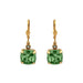 The earrings feature a 10mm (3/8 inch) square Swarovski crystal in a brilliantly flashing emerald-like green color. Small black diamond round Swarovski crystal on front of ear wire.