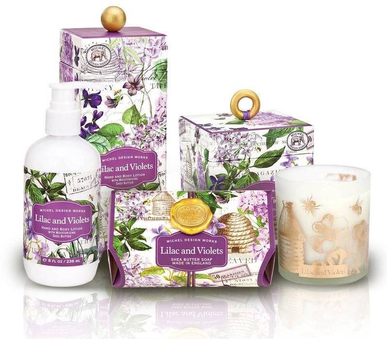 The classic scent of Lilac and Violets features wild blooming lilacs with undertones of hyacinth, violets, and white carnation is now available in a beautiful gift set. The gift set includes our hand and body lotion that is made with shea butter, aloe, and other botanical ingredients. Our triple-milled soap that is silky smooth and long lasting, and contains the finest pure palm oil, glycerin, and rich shea butter. As well as our all-natural, 100% soy wax candle is nontoxic, biodegradable, and clean burning.