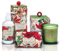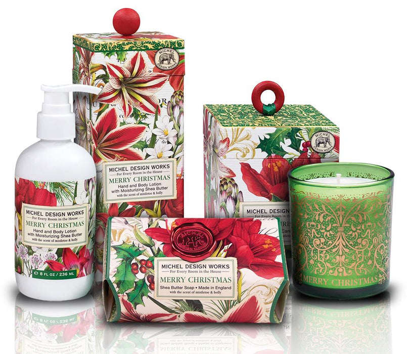 Showy amaryllis with classic Christmas holly and pine highlight a lush collection of winter florals. Our Merry Christmas gift set has the scent of holly and winter florals with touches of carnation, rain, bamboo, and palm leaves. The set includes our triple-milled soap that is silky smooth and long lasting, and contains the finest pure palm oil, glycerin, and rich shea butter. Our hand and body lotion that is made with shea butter, aloe, and other botanical ingredients. And our all-natural, 100% soy wax candle that is nontoxic, biodegradable, and clean burning.