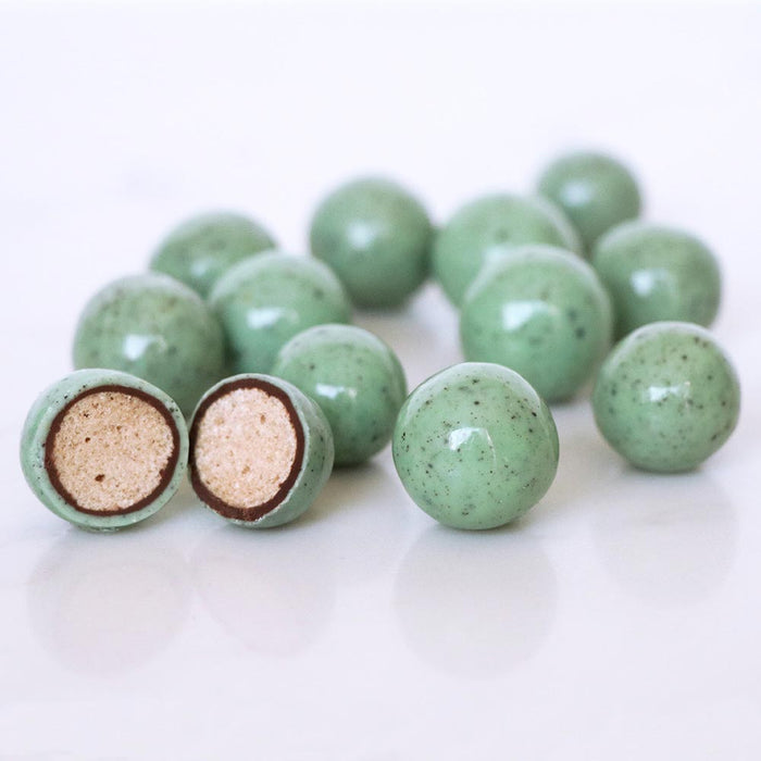 A crunchy malted milk center that is dipped in milk chocolate and then covered with mint and cookie coating. The result is a fresh tasting melt-in-your mouth confection. These green pastel colored treats are perfect to bring a spring to your step with their minty fresh flavor.