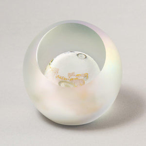 . Inspired by the designer's interpretation of the solar system, each weight takes a team of 2-3 artists to create. These carefully formed designs use a wide spectrum of specialty colors, dichroic glass, glow material, and precious metals. Intricate craters dusted with gold shine brightly from the depths of this beautiful paperweight.