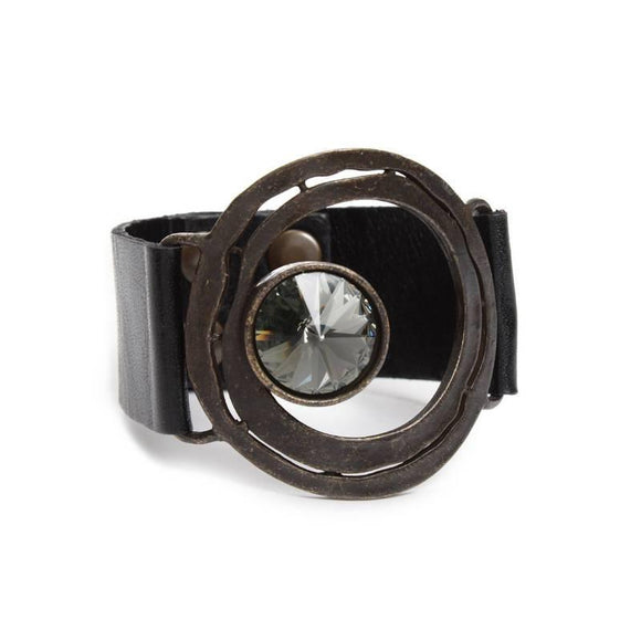 Rebel crack bracelet. Antique brass finish with black diamond Swarovski crystal. Genuine Italian leather. Adjustable snap closure. Handmade in New York.