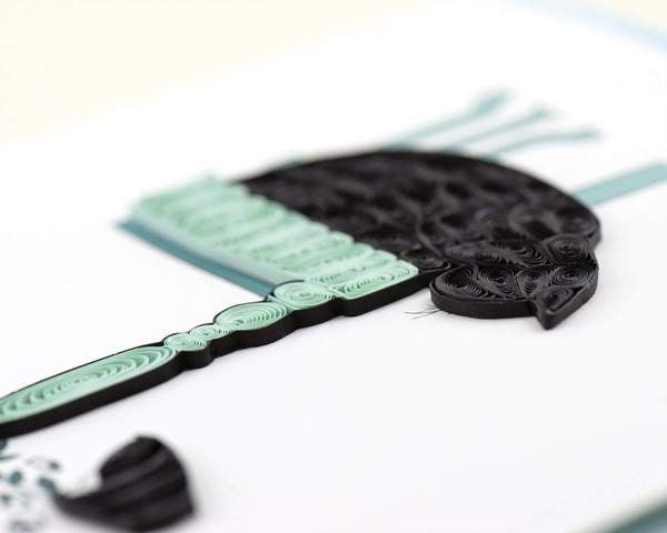 Our feline friends can be mischievous, but we still love them! Share our Quilled Black Cat and Broken Vase card with your favorite cat parent for any occasion! This card features a black cat on a blue table with a smashed vase on the floor below.