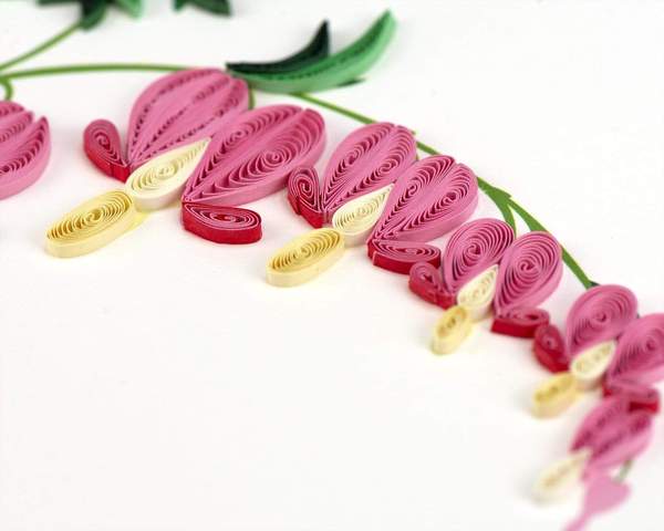 Share a message of unconditional love and compassion with a quilled bleeding heart greeting card. The design depicts a vine of pink bleeding heart flowers accompanied by green leaves.