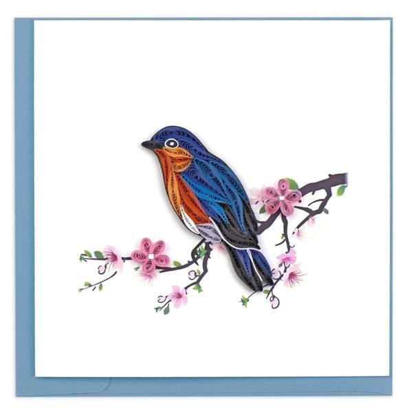 The bluebird, as seen on this quilled greeting card, is known to be symbolic of both happiness and good luck. Paper strips in various shades of orange and blue are carefully arranged to realistically reflect the bird's vibrant feathers. Pink flowers along the branch of which this bluebird is seen perched complete the design, resulting in a beautiful piece of art to share with your loved ones.