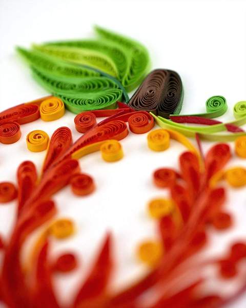 Description: Wish your friends and family warm Autumn tidings with this swirling, quilled masterpiece. All of our cards come with a coordinating envelope, and a short history of quilling on the back of the card. Our square cards require extra postage.