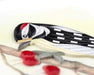 A quilled downy woodpecker—the smallest of the woodpecker species—is featured on this handcrafted greeting card where it is seen perched on a branch with red berries. This distinct bird is easy to spot by it's a white face marked by a red streak and black wings that have a spotted white pattern. All of the details which make this bird unique can be seen in this realistic, quilled piece of art.