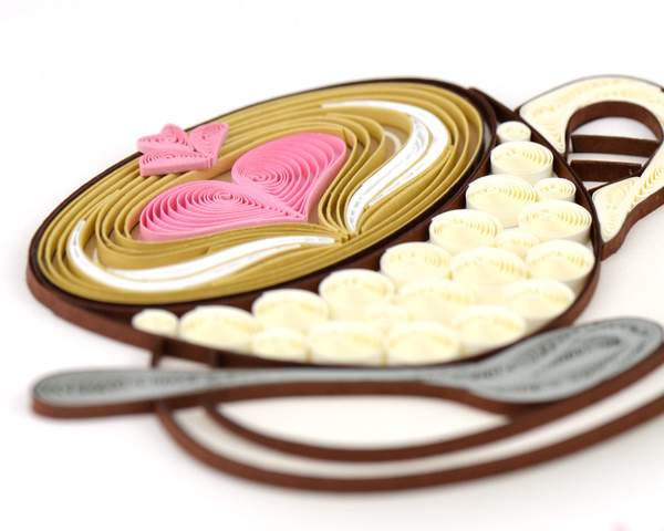 The Love Latte greeting card is an unforgettable way to tell the coffee lover in your life how you feel. This card contains a quilled coffee cup on a platter, with a heart made out of coffee foam.