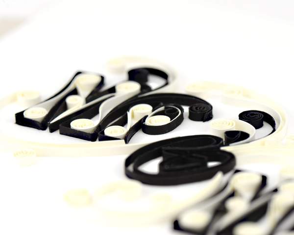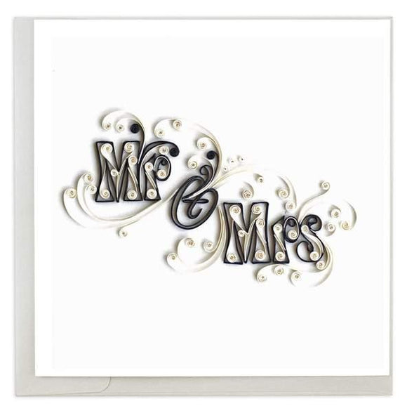 The quilled Mr and Mrs greeting card is the perfect card to give someone on their wedding day or to celebrate a relationship. This cards says, Mr and Mrs in stylized quilling and has a variety of quilled white, blue and red swirls and shapes