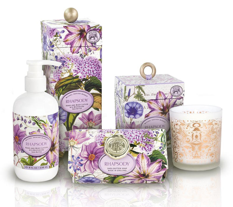 Our Rhapsody gift set features the scent of sweet butterfly bush with accents of honey, carnation, and rain. All which includes our triple-milled soap that is silky smooth and long lasting, and contains the finest pure palm oil, glycerin, and rich shea butter. Our hand and body lotion that is made with shea butter, aloe, and other botanical ingredients. And our all-natural, 100% soy wax candle that is nontoxic, biodegradable, and clean burning.