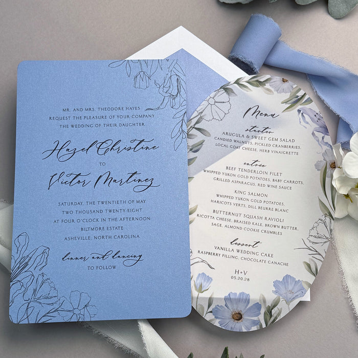 Silhouette embraces subtle sketches and a "something blue theme". Perfect for the couple looking for originality and color but still evoking a soft and encompassing love.