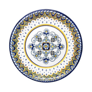 Our Sorrento dinner plate inspired by small village artisans in Italy has a beautifully rich color palette of deep blue and golden yellow paired with a unique and beautiful artisinal design. With it's exceptional weight and luxurious textured surface treatment it has the appearance of real ceramic.
