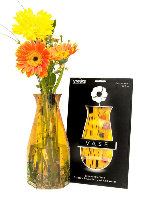 Modgy Expandable flower vases do everything a glass vase does except collect dust, chip or break. These BPA free plastic vases are durable and stable enough to hold a flower bouquet and are ideal for events, weddings, and any table top. Modgy vases are collapsible and economical, making it easy to keep a variety of colors and patterns tucked away for any occasion. To clean, rinse with water and dish soap. Leave open to dry, store flat. This vase is inspired by The Kiss by Gustav Klimt.