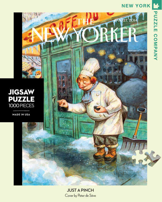 Help melt away the icy sidewalks with this humorous puzzle featuring a clever chef using his baking skills in an entirely new way. Perfect for the home chef in your life, this puzzle makes a great piece of art to frame once it's completed. Artwork illustrated by Peter de Séve for the January 27, 2014 cover The New Yorker magazine. The covers of The New Yorker have entertained and enlightened the magazine's readers for nearly a century. With unmatched visual sophistication and wit, they let no subject escape their scrutiny. A roster of extraordinary artists continues to create indelible images that are infinitely varied in style and tone, whether whimsical, provocative, serene, or lough-out-loud funny. From the iconic Eustace Tilley to spot-on images of contemporary life, The New Yorker's covers are always the talk of the town.