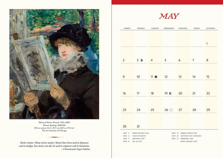 This calendar includes works by masters such as Claude Monet, Mary Cassatt, Pierre-Auguste Renoir, and Louis Comfort Tiffany. Well-chosen words on the pleasures of reading, from historic and contemporary female writers and readers alike, accompany each of the twenty images in this calendar. Size: 6 x 8¼ inches.