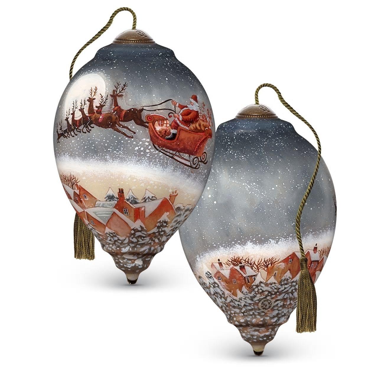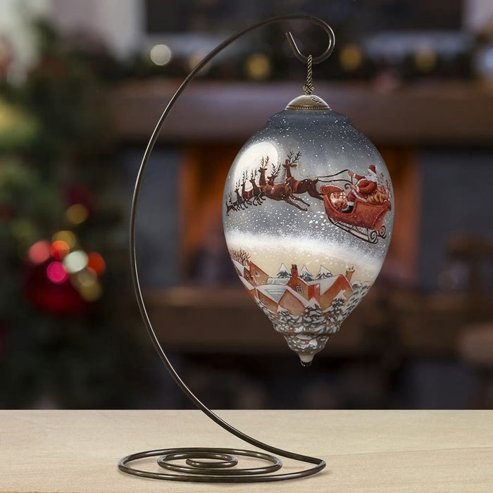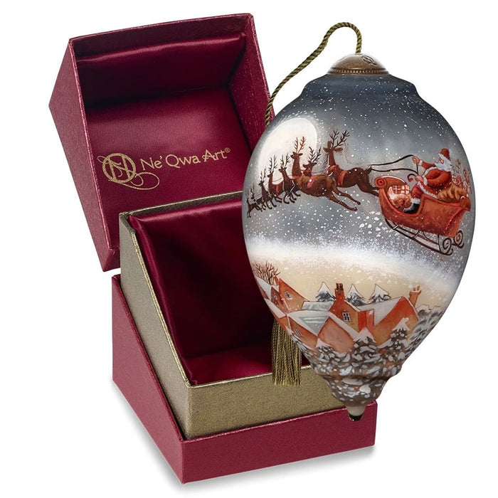 Santa Claus and his reindeer fly up, up, and away over a charming village. A full moon lights the way and a sleigh full of Christmas gifts adds an accent of pure holiday joy to Christmas décor for years to come. Artwork inspired by original artist Jim Mitchell is reproduced by Ne’Qwa Art® with the centuries-old technique of hand-painting in reverse on the inside of blown glass. Makes a perfect gift for people who love classic Christmas traditions and Santa Claus holiday décor. Packaged in an elegant foil-stamped, satin-lined gift box with a Certificate of Authenticity. Meticulously crafted in blown glass and expertly hand-painted. Adjustable tasseled cord included for display on Christmas tree or ornament stand.