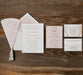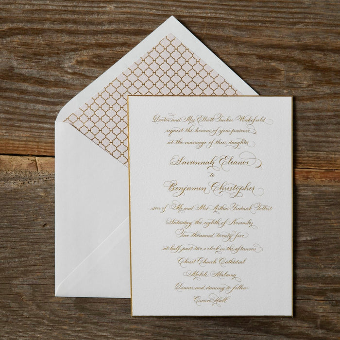 The Wakefield Suite exquisitely displays its hand calligraphed text in metallic gold engraving on an enviably thick Bella Figura Cotton cardstock.