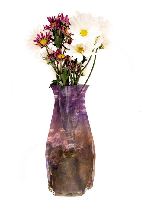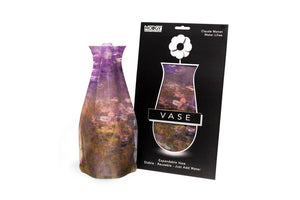 Modgy Expandable flower vases do everything a glass vase does except collect dust, chip or break. These BPA free plastic vases are durable and stable enough to hold a flower bouquet and are ideal for events, weddings, and any table top. Modgy vases are collapsible and economical, making it easy to keep a variety of colors and patterns tucked away for any occasion. To clean, rinse with water and dish soap. Leave open to dry, store flat. This vase features Water Lilies by Claude Monet.