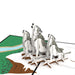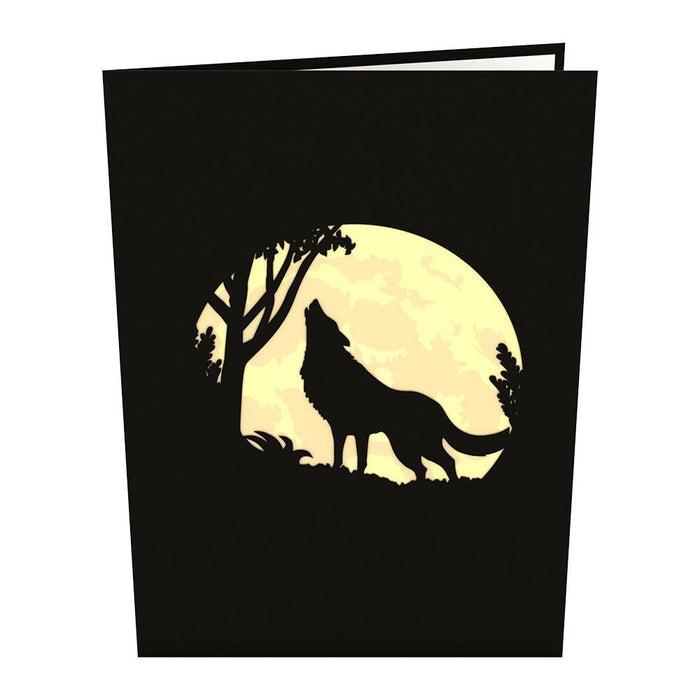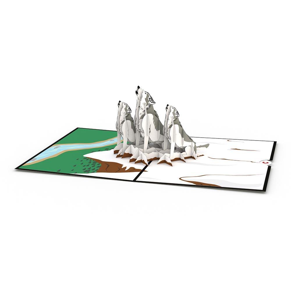 The black silhouette of a lone wolf howls to the moon on the laser-cut front of this ink black card. Insider, its pack — three beautiful grey and white wolves — point their noses to the sky in this intricate pop-up paper sculpture. The trio stands atop a snow-capped cliff that peers onto the expansive, illustrated mountain range and babbling brook below.